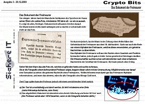 In KryptoBit Nr. III geht es um ein uraltes Foto, welches ein noch älteres und unbekanntes Dokument der Freimaurer zeigt. Es enthält die Geheimschrift der Freimaurer und wäre damit eine Sensation. Ein Professor behauptet aber, dass das Foto und das darauf abgebildete Dokument eine Fälschung seien. Beides sei nichts wert, sagt er ...