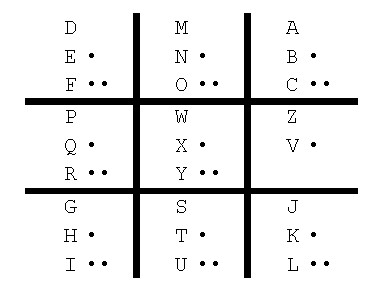 These nine field are not sufficient to represent 26 characters, so additional dots (one or two) help. Here are some examples.